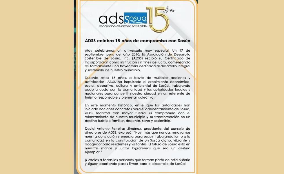 Sosúa, - La Asociación de Desarrollo Sostenible de Sosúa (ADSS), celebró su decimoquinto aniversario, el pasado miércoles 17 de septiembre, “renovando su convicción y energías para seguir trabajando junto a la comunidad por un Sosúa digno, vibrante y acogedor para