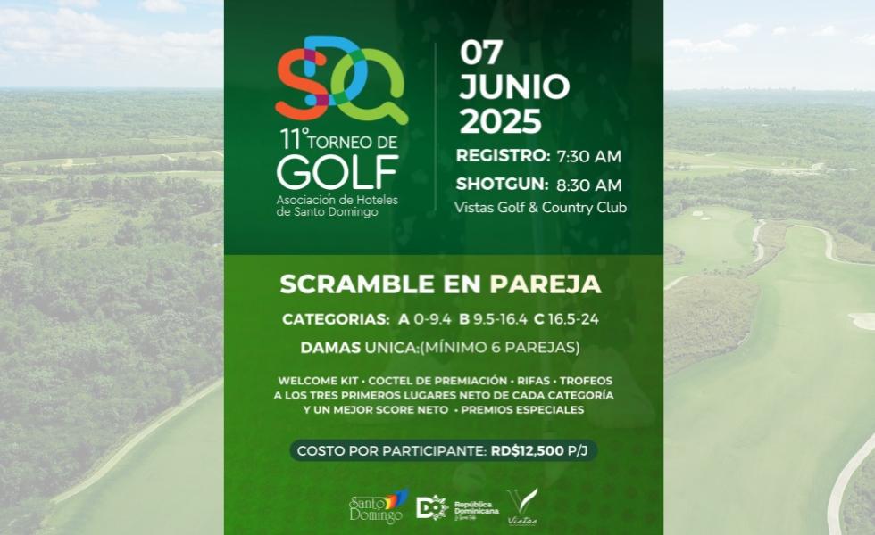 La Asociación de Hoteles de Santo Domingo (AHSD) realizará la XI edición del torneo SDQ Golf 2025, en Vistas Golf & Country Club, el sábado 7 de junio 2025. La justa se realizará en la modalidad scramble en pareja, en la